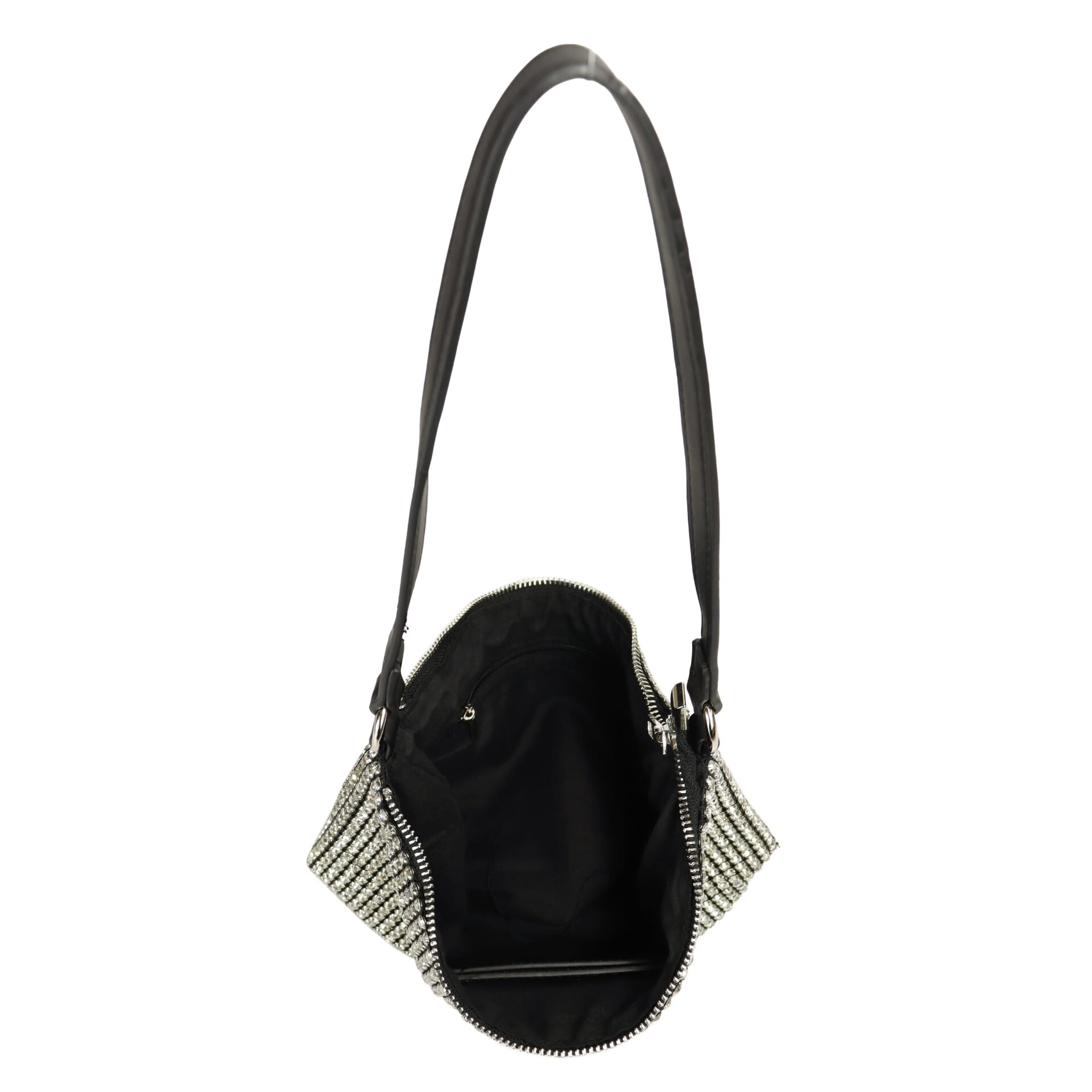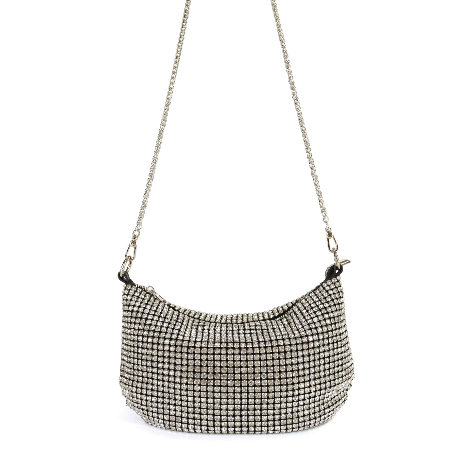 La Tracolla in strass Argento firmata Dudlin e' una morbida tracolla con manico corto e lungo in catena.Una superficie interamente ricoperta di strass scintillanti che cattura la luce da ogni angolazione, rendendola una perfetta borsa gioiello.Dotata di una raffinata tracolla a catenella removibile, può essere indossata a spalla, a tracolla o portata a mano per adattarsi a ogni esigenza.Pratica chiusura a zip che non solo protegge i tuoi effetti personali ma aggiunge un ulteriore dettaglio di classe al design complessivo.Ideale per contenere l'essenziale come smartphone, rossetto, chiavi e carte di credito, senza appesantire il tuo look.