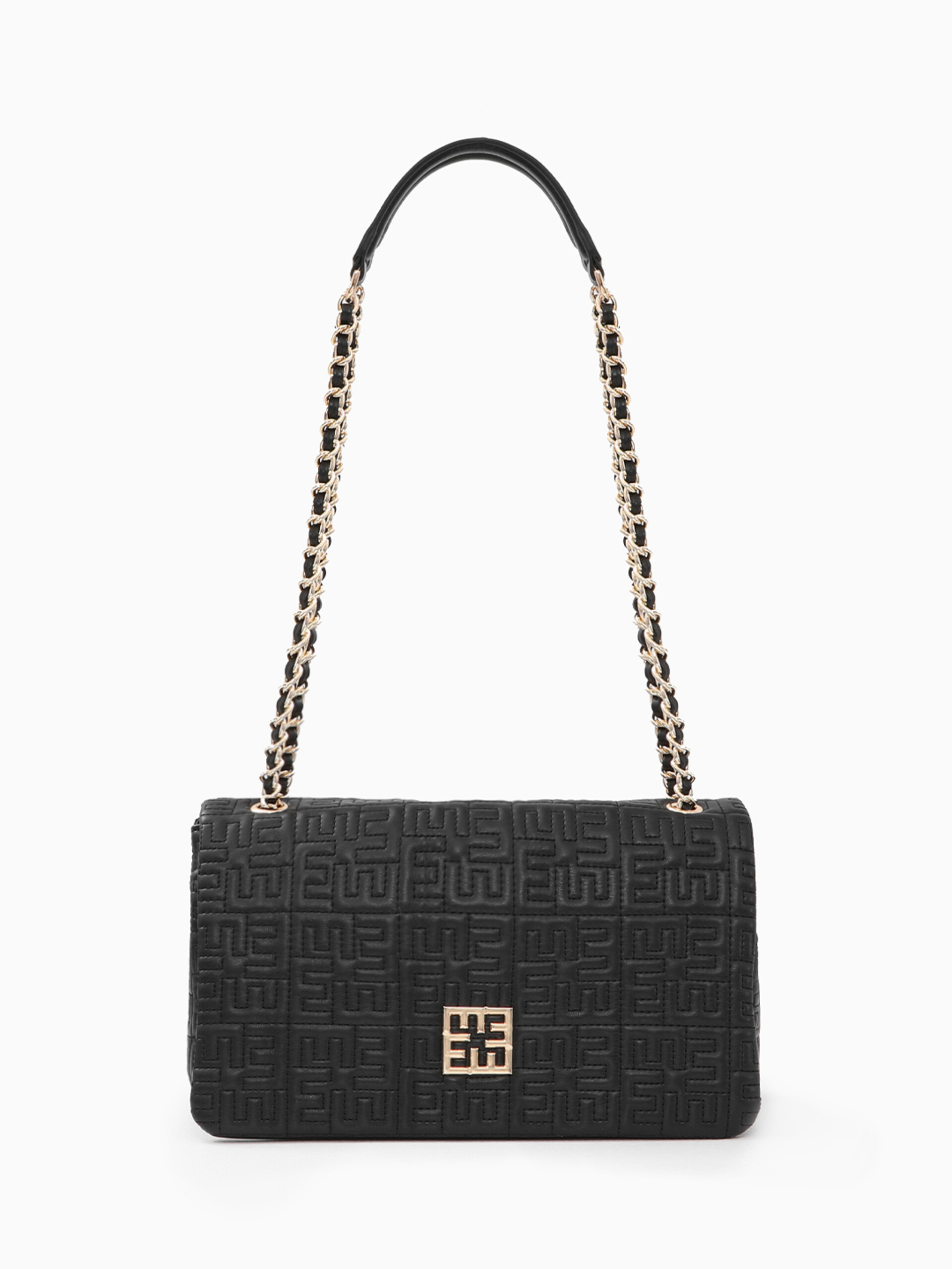 La borsa Doppi manici con catena della linea Rosemary con effetto Goffrato firmata Ermanno Scervino e' realizzata in materiale di alta qualità per durare nel tempo, elegante modello di Ermanno Scervino caratterizzata da uno spirito moderno simbolo di femminilità, completata dall’emblematico logo Ermanno.La borsa a ha la chiusura con patta e calamita, finiture in effetto oro, tasca interna con chiusura a cerniera piatta, fodera interna personalizzata.Disponibile nel colore Nero ti valorizzera' tutti i tuoi look invernali
