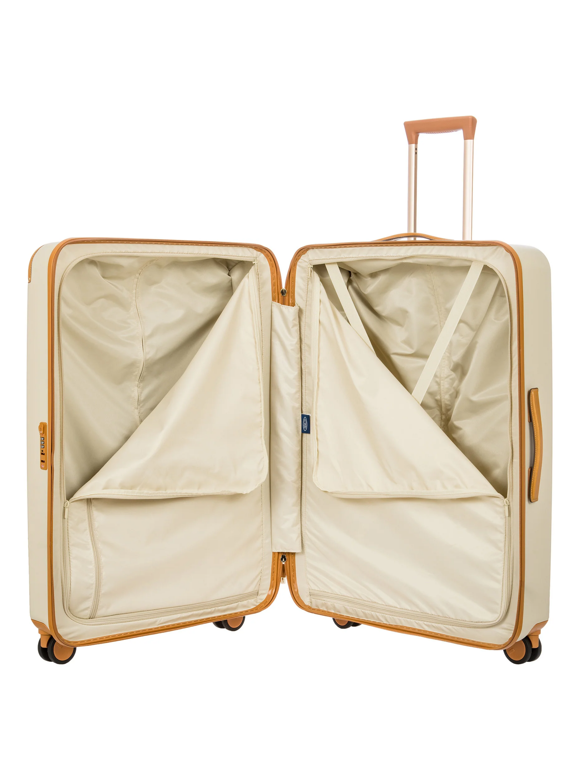Il Trolley Grande extralarge Amalfi Cream che BRIC'S ti propone e' un trolley extralarge e' realizzato in policarbonato riciclato , un materiale leggero , flessibile e ultraresistente, una cerniera a doppio cursore, con finiture gommate che la rende idrorepellente . Sono adatti ai viaggi intercontinentali grazie alla chiusura a combinazione laterale TSA .Le 4 ruote gemellari e piroettanti , progettate per facilitare il trasporto della valigia, rendono pratico ogni spostamento sia esso in aereo,in macchina o in treno.Il carrello con push button, rende fruibile il traino.Tutti gli interni sono completamente con divisorio e ferma abiti garantendo la massima capienza e praticita'.